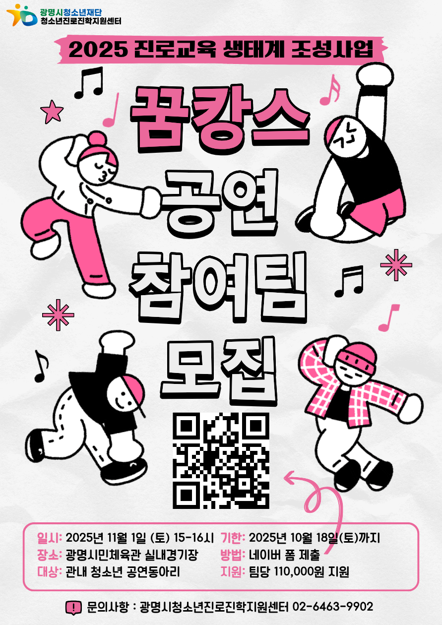 광명시청소년진로진학지원센터입니다. 올해로 10주년을 맞은 광명시청소년진로박람회가 새로운 무대와 강연으로 더욱 다채롭게 돌아옵니다🎉 <꿈을 찾아 떠나는 ‘꿈캉스’> 무대를 함께 꾸며줄 ★청소년 공연 동아리(댄스, 밴드 등)★를 모집하오니 많은 관심과 참여 바랍니다! 🌈 운영 개요 사업명 : 2025년 진로교육 생태계 조성사업 꿈을 찾아 떠나는 <꿈캉스> 일시 : 2025. 11. 1.(토) 15:00 ~ 16:00 장소 : 광명시민체육관 실내경기장 대상 : 광명시 청소년 및 시민 200명 🎶 모집 개요 모집대상 : 광명시 관내 청소년 공연 동아리 (댄스, 밴드 등) 신청기간 : 2025. 9. 29.(월) ~ 10. 18.(토) 신청방법 : 네이버 폼 제출 → https://naver.me/GScLv9ep 지원사항 : 팀당 공연비 110,000원 지원 📞 참가 문의 광명시청소년진로진학지원센터 ☎ 02-6463-9902 |
