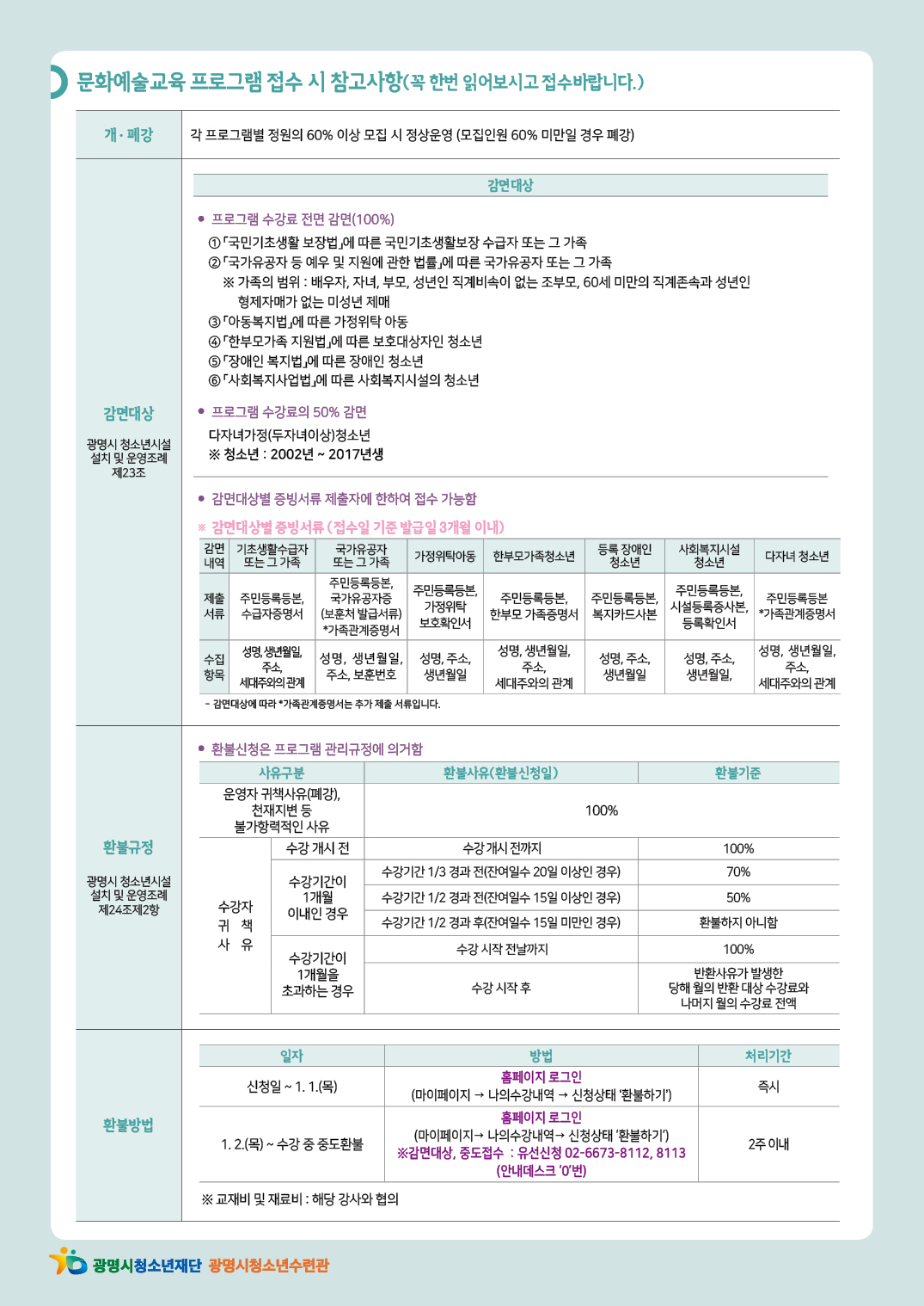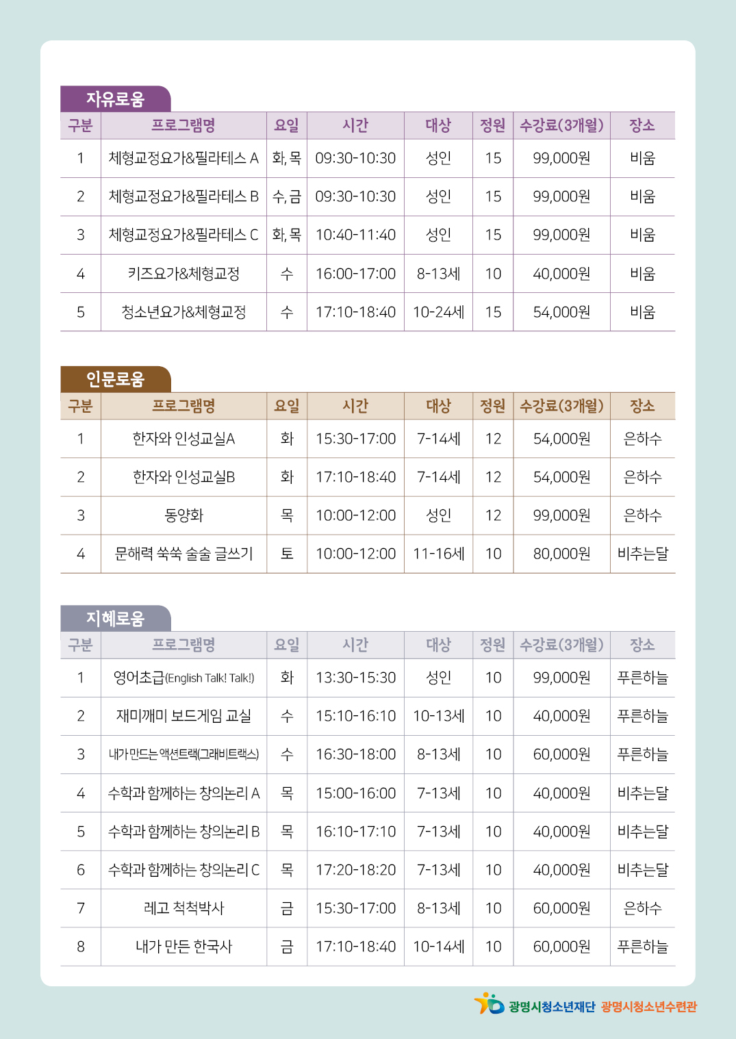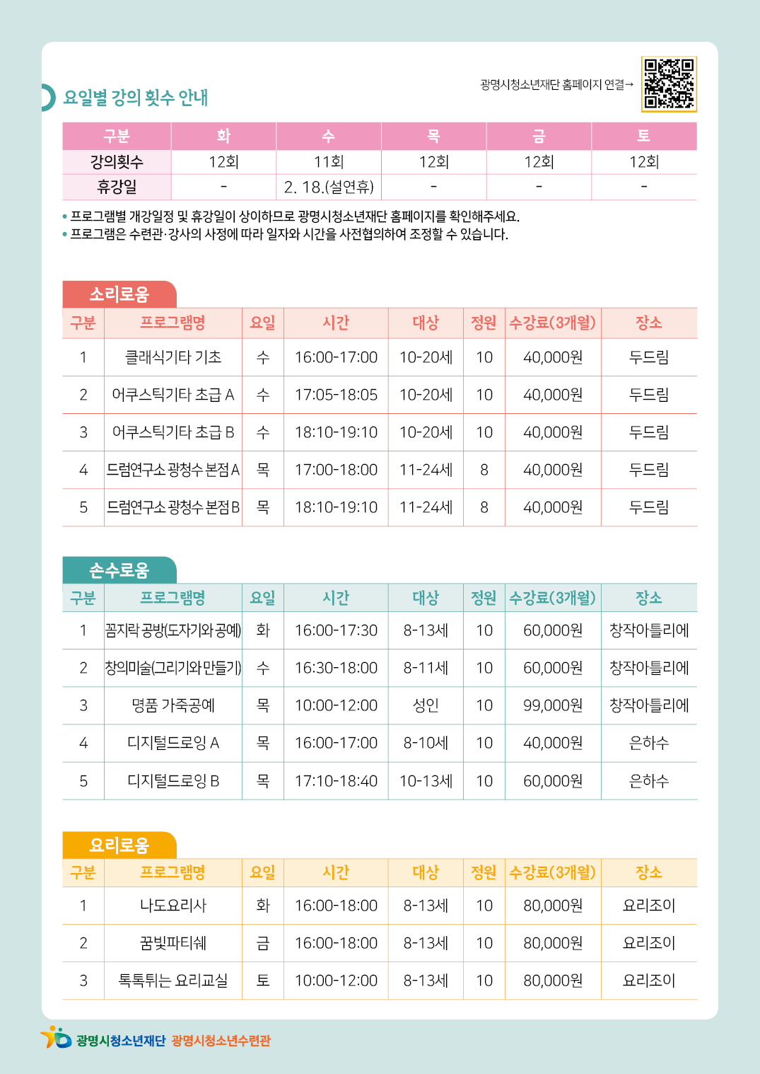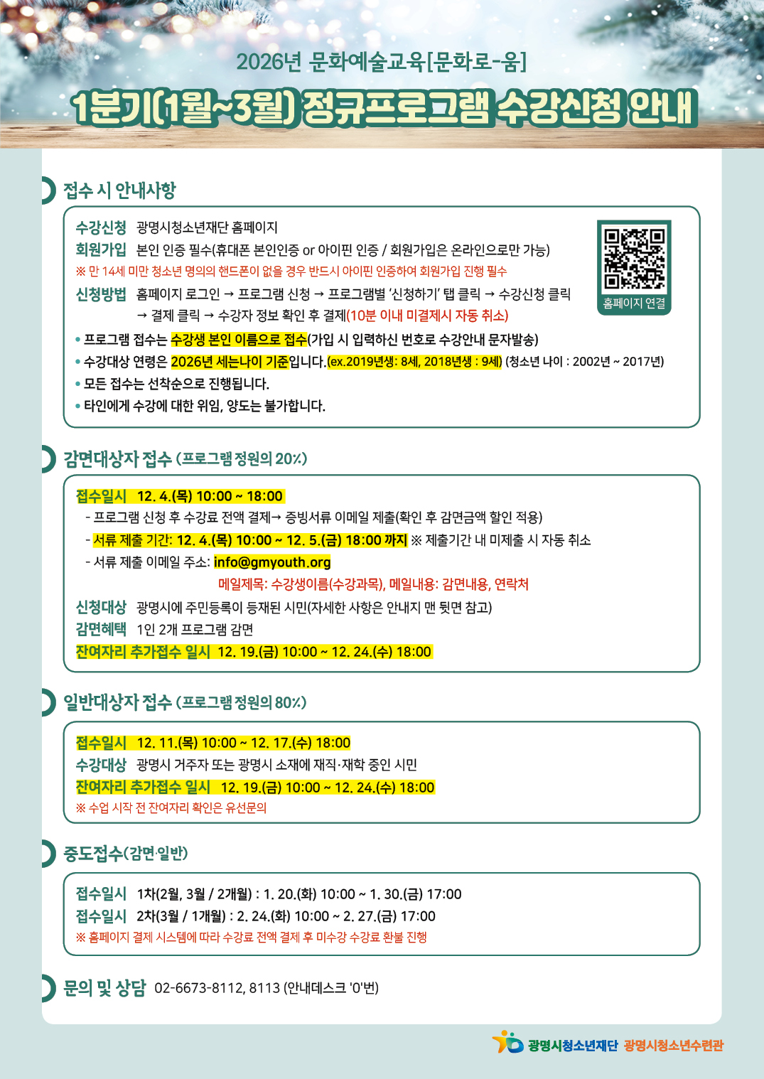 🌟 새해 ✨새로운 배움! 광명시청소년수련관에서 여러분의 1분기를 풍성하게 채워 줄 다양한 문화·예술·교육 프로그램이 열립니다! 이번 겨울❄️, 배움과 재미를 한번에 잡아보세요🤩 📌 접수 전 꼭 확인하세요! ✔ 수강생 본인 이름으로 회원가입 필수! ※ 부모님 이름·가족 공동 계정 X → 수강생 본인 아이디로 로그인해야 신청 가능 ✔ 모든 접수는 선착순으로 진행됩니다! ✔ 프로그램은 26년 1분기(1~3월) 운영입니다. |