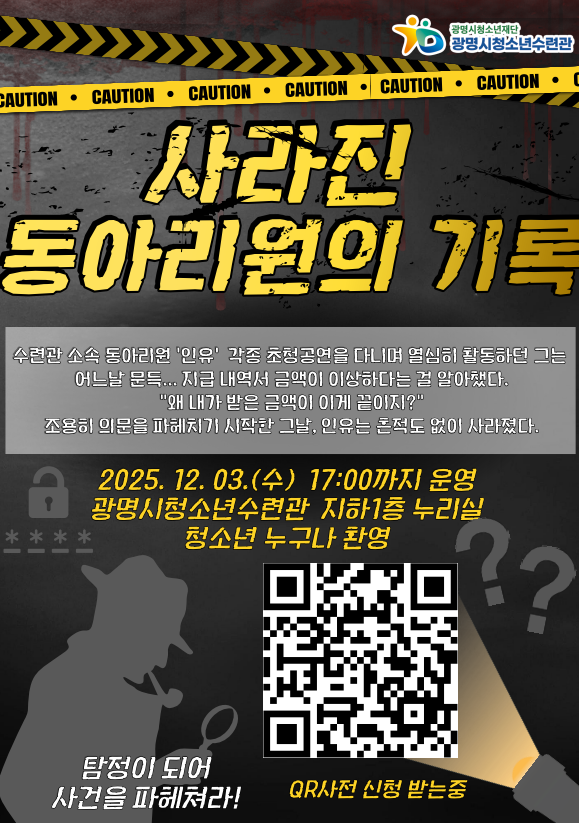 그 날 시작된 조용한 추적을 함께 파헤쳐라! 광명시청소년수련관 방탈출존 – 사라진 동아리원의 기록 📅 운영일시 2025년 12월 3일(수) 17시까지 📍 장소 광명시청소년수련관 지하 1층 누리실 🕵 청소년 누구나 참여 가능! 광명시청소년수련관을 뒤흔든 미스터리를 함께 풀어낼 예비 탐정 청소년이라면 모두 환영합니다! |
