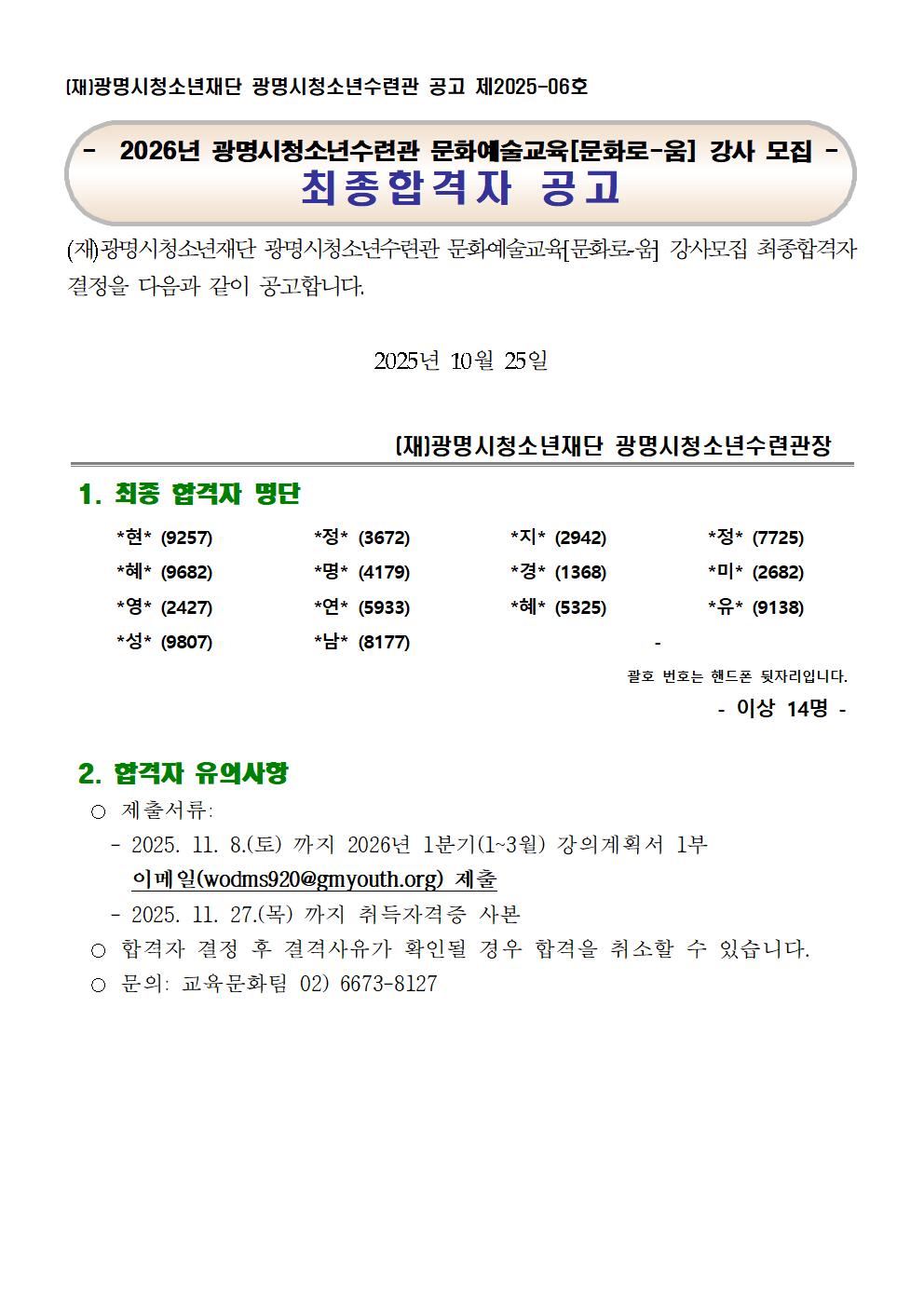 채용공고 홈 알림마당 프로그램 및 대관신청 알림마당 홍보 사업소개 수련관소개 채용공고 공지사항 채용공고 소통게시판 자료실 sns공유 열기 이 페이지 공유하기 sns공유 닫기 페이스북 X 블로그 프린트 홈 알림마당 채용공고 [수련관]채용공고 상세보기 - 제목, 내용, 파일 정보 제공 [문화로움]26년도 신규강사 최종 합격자 결정 공고 이미지 확대보기 광명시청소년수련관 2026년도 문화로움 신규강사 최종 합격자를 다음과 같이 공고합니다. 파일 jpg 문서 2026_최종합격자 안내 공고문001.jpg 목록 게시물삭제 광고 반복작성 욕설 본인삭제 게시물삭제 이전글 [문화로움] 26년도 신규강사 서류심사 합격자 및 면접심사 시행계획 공고