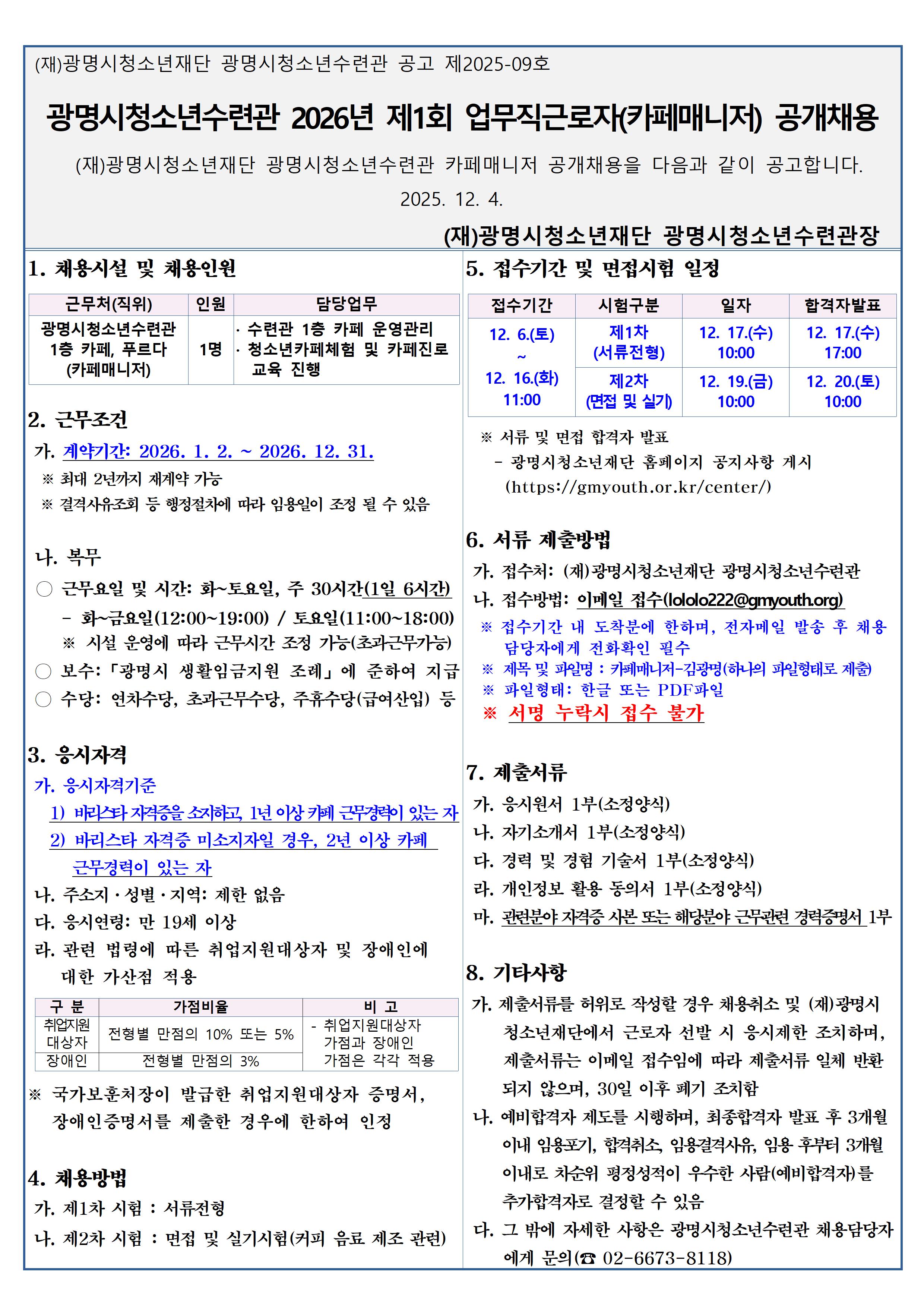 | 광명시청소년수련관 2026년 제1회 업무직 근로자(카페매니저) 공개 채용 | |