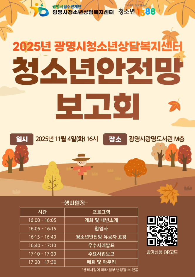 공유하고자 <광명시 청소년안전망 보고회>를 개최합니다. - 일시: 2025년 11월 4일(화) 16:00-17:30 - 장소: 광명시광명도서관 M층 강당(광명시 원광명안로 48) - 참가신청: 네이버폼 링크 및 QR코드/ 링크 https://naver.me/xS1fdH1i - 문의: 02-2681-2001 / 02-2681-2007(김희선상담사) 감사합니다. |