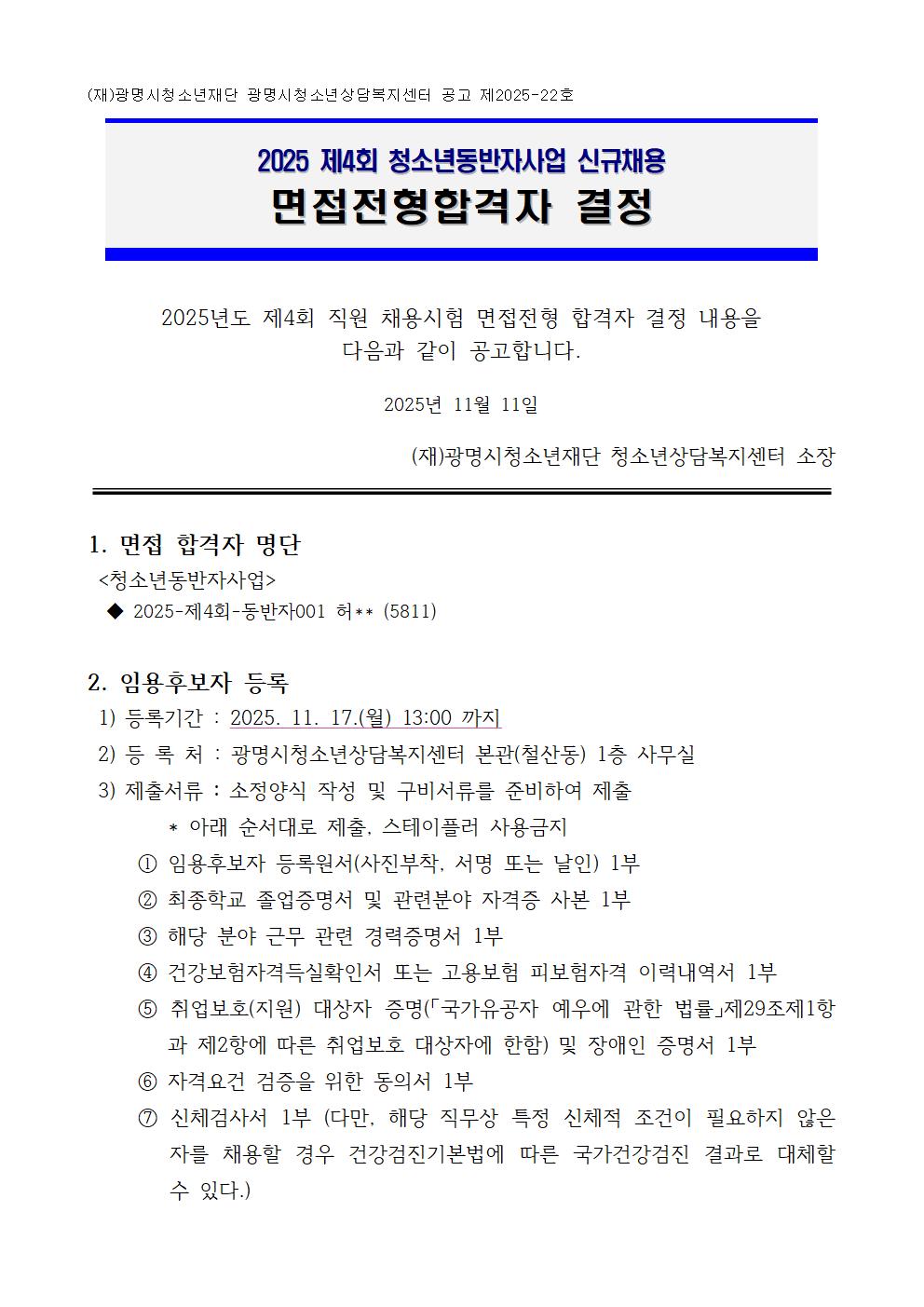 2025년도 제4회 청소년동반자(YC)사업 신규채용 면접전형 합격자를 위와 같이 공고합니다. |