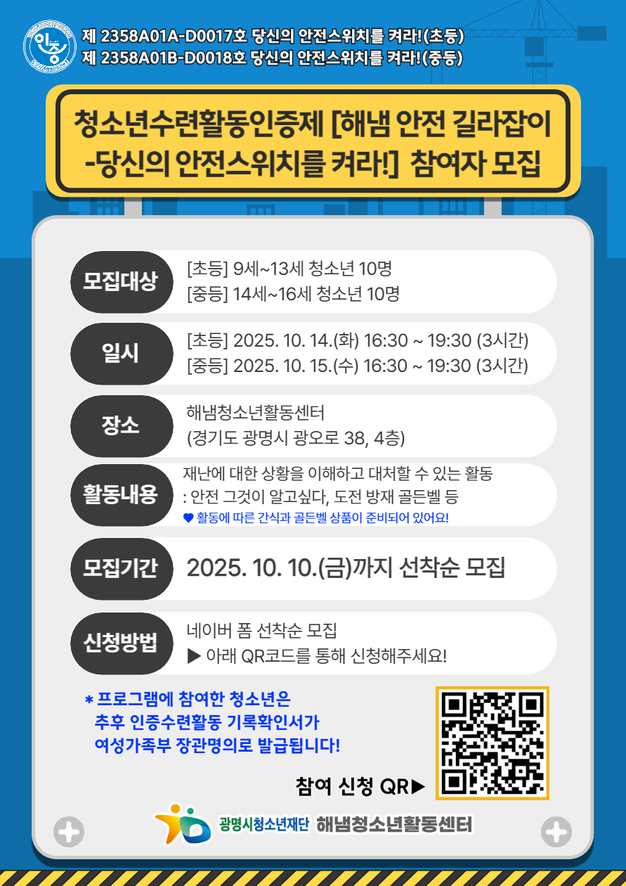 [해냄 안전 길라잡이-당신의 안전스위치를 켜라!] ⚠️참여자 모집⚠️ . . 본 프로그램은 청소년이 재난에 대한 상황을 이해하고 대처할 수 있는 방법을 배우는 프로그램입니다. . . ✅모집일시 및 대상 1) 초등(9~13세 청소년) 10명 - 2025. 10. 14.(화) 16:30~19:30(3시간) 2) 중등(14~16세 청소년) 10명 - 2025. 10. 15.(수) 16:30~19:30(3시간) ✅장소: 해냄청소년활동센터 ✅모집기간: 2025. 10. 10.(금)까지 선착순 모집 ✅신청링크: https://naver.me/xS1SELgA . . ❤️프로그램에 참여한 청소년은 추후 인증수련활동 기록확인서가 여성가족부 장관명의로 발급됩니다! . . #광명시 #광명시청소년재단 #해냄청소년활동센터 #청소년수련활동인증제 #참여자모집 |