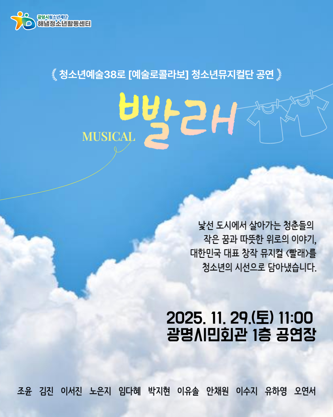 청소년예술38로 [예술로 콜라보] . . 청소년뮤지컬단이 준비한 공연은 20년 넘도록 많은 관객에서 사랑받아온 대한민국을 대표하는 창작 뮤지컬 <빨래>입니다. 지친 하루를 살아가는 우리 모두를 따뜻하게 위로해 주는 이야기로 잘 알려져 있는 <빨래>의 주요 장면들을 모아 20분으로 재구성한 버전입니다! . . 짧지만 핵심 메세지와 감동을 온전히 담아낸 무대, 많은 기대와 응원 부탁드려요 🙂 . . #광명시 #광명시청소년재단 #해냄청소년활동센터 #청소년예술38로 #예술로콜라보 #뮤지컬_빨래 |