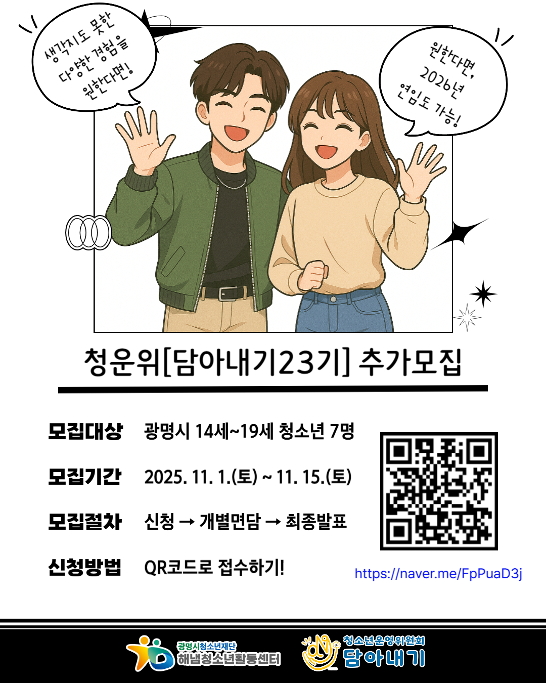 청소년운영위원회 [담아내기23기] 청소년위원 추가 모집❤️ . . ✅모집대상: 광명시 14세~19세 청소년 7명 ✅모집기간: 11월 1일(토)~11월 15일(토)까지 ✅모집절차 -온라인 신청서 작성 -개별 면담 -최종발표 ✅신청링크: https://naver.me/FpPuaD3j . . 새롭고 다양한 활동을 하고 싶은 사람이라면 신청해주세요! 2025년 활동뿐만 아니라 2026년에도 연임 가능합니다! . . #광명시 #광명시청소년재단 #해냄청소년활동센터 #청소년운영위원회 #담아내기23기 #추가모집 |
