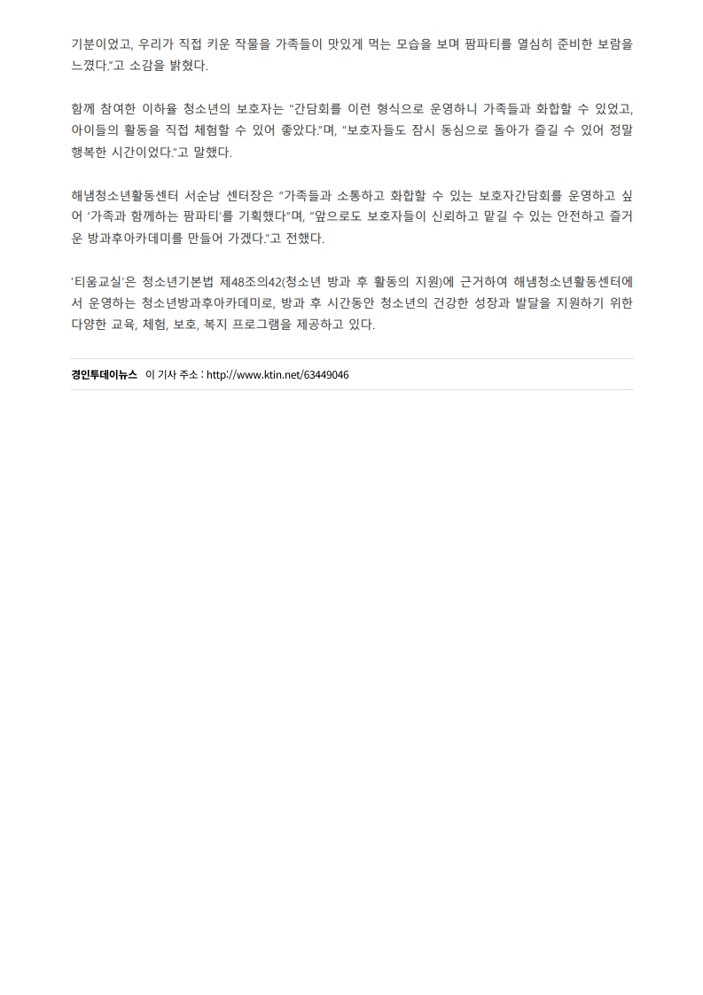 | 헤냄청소년활동센터 청소년방과후아카데미[티움교실] '가족과 함께하는 팜파티 & 보호자 간담회' 성료 | |