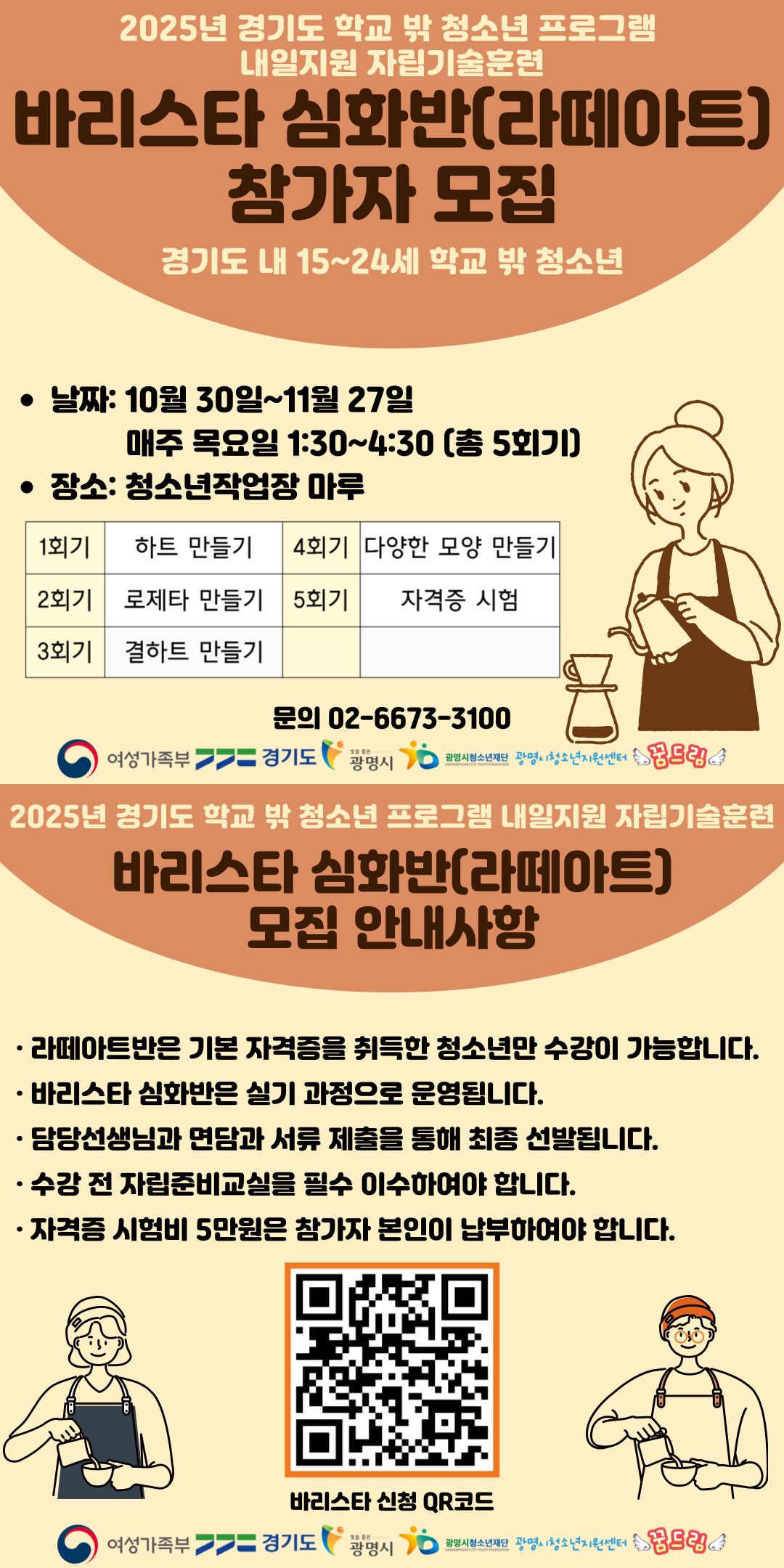 관심있던 청소년은 꼭 신청바랍니다~ https://naver.me/GhSHoGAr *바리스타 기초 자격증 소지자 수강 가능 |