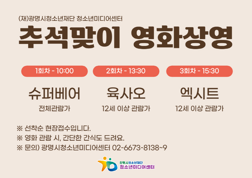“송편만 먹고 끝내기 아쉽죠? 🍡 이번엔 영화도 함께 즐겨요~!” 📅 일시 : 10월 4일(토) 오전 10시부터 📍 장소 : 청소년미디어센터 스튜디오 (광명시청소년수련관 3층) 👨👩👧👦 대상 : 청소년 & 지역 주민 관람인원 : 영화별 선착순 10명 (현장접수) 🍿 상영작 라인업 10:00 🐻 슈퍼베어 (전체관람가) 13:30 🥢 육사오 (12세 이상) 15:30 🚪 엑시트 (12세 이상) ✔️ 가족, 친구, 이웃 다 함께 오셔도 좋아요 💕💕 문의 : ☎ 02-6673-8138~9 |