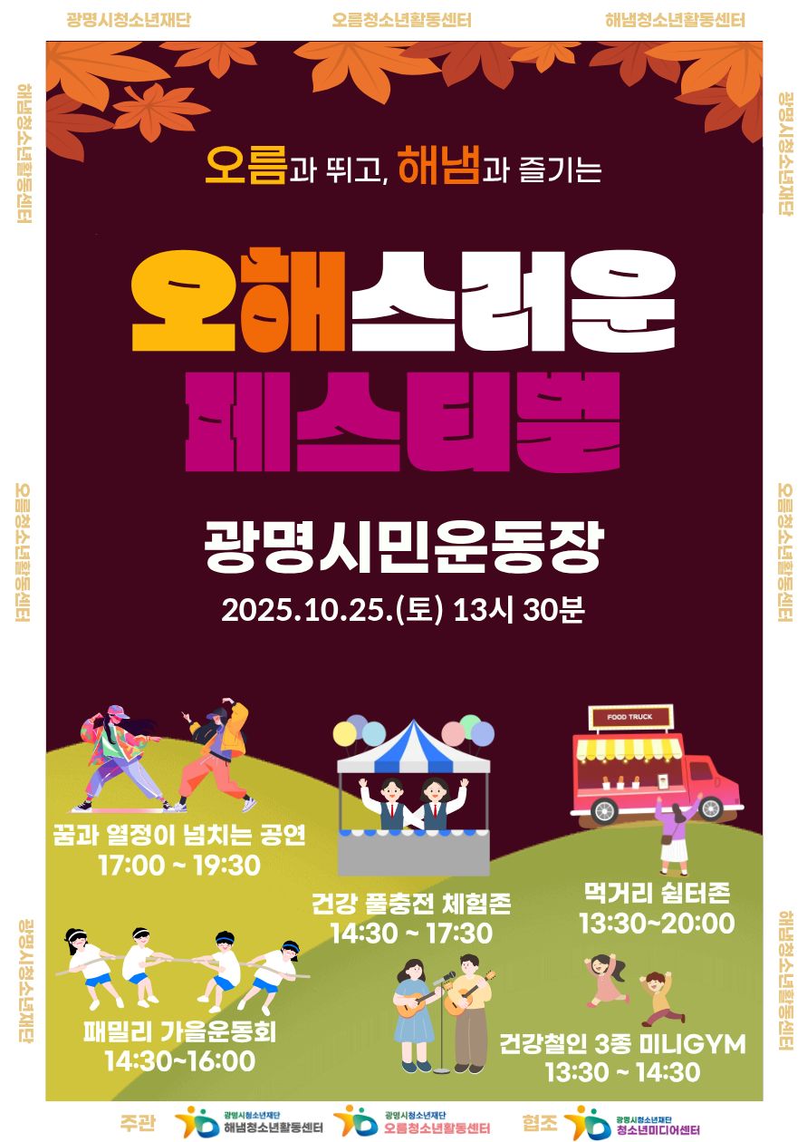 오해스러운 페스티벌 D-DAY 3🔥🍁 오름청소년활동센터 X 해냄청소년활동센터가 뭉쳤다❗️ 꿀잼 보장인데 안온다구? 놀거리 볼거리가 얼마나 많은데 ~~ 🌈행사일시 : 2025.10.25.(토) 13:30~19:30 🌈행사장소 : 광명시민운동장 잔디구장 - 광명시청 뒷편아래 잔디구장이야! 🌈행사내용 1) 13:30~14:30 건강철인3종 미니 GYM (13시부터 현장접수) 2) 14:30~16:00 패밀리 가을 운동회 (13시부터 현장접수+사전 신청팀) 3) 14:30~17:30 12종류의 건강 풀세트 체험존 운영 4) 17:00~19:30 꿈과 열정이 넘치는 공연 + 더불어 맛난 분식과 쉼터존까지! 이래도 안온다구? 1년에 단 한번! 참여기회! 건강해질 기회! (속닥속닥) 이번주 토요일 날씨가 가을 그 자체래🍁😊 친구 동생 누나 오빠 이모 다같이 놀러와🩷 기다릴게👀💜 |