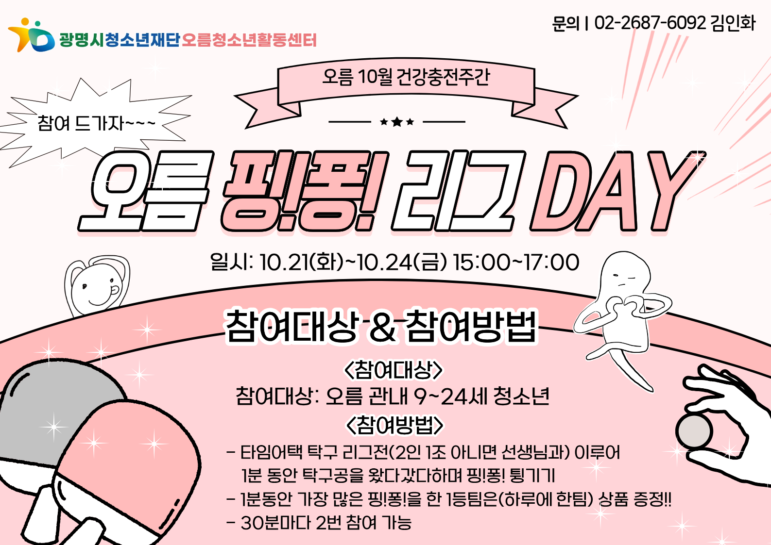🔥🔥오름 핑! 퐁! 리그 DAY 🔥🔥 10/21(화) ~ 10/24(금) 15:00 ~ 17:00 2인1조가 팀을 이뤄 타임어택으로 탁구공을 주고받으며 튕겨보자!🏓 30분마다 팀별 2번씩 참여가능하며, 하루에 한팀! 가장 많은 핑!퐁!을 한 1등팀에게는 상품 증정!🏆🏆 장소 : 오름청소년활동센터 문의) 02-2687-6092 담당자 김인화 #오름 #핑!퐁 #리그 #DAY #탁구 #올림픽 #종목을 #경험해보세요! |