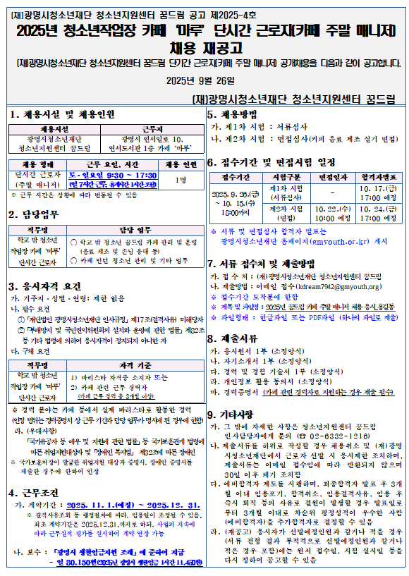 | [꿈드림] 광명시청소년지원센터 꿈드림 2025년 청소년작업장 카페 '마루' 단시간 근로자(카페 주말 매니저)채용 재공고 | |