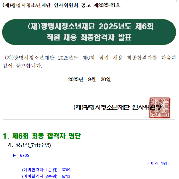 | (재)광명시청소년재단 2025년도 제6회 직원 채용 최종합격자 발표 | |