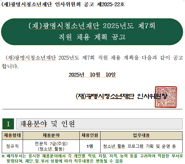 | (재)광명시청소년재단 2025년도 제7회 직원 채용 계획 공고 | |