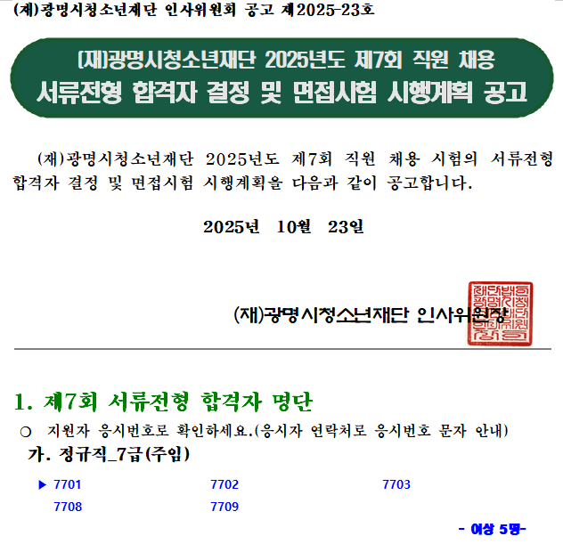 채용공고 홈 알림마당 운영시설 주요사업 프로그램 신청 알림마당 아카이브 재단소개 윤리인권경영 마이페이지 로그인 채용공고 공지사항 채용공고 입찰공고 정보공개 경영공시 소통게시판 보도자료 언론에 비친 재단 카드뉴스 sns공유 열기 이 페이지 공유하기 sns공유 닫기 페이스북 X 블로그 프린트 홈 알림마당 채용공고 [재단]채용공고 상세보기 - 제목, 내용, 파일 정보 제공 (재)광명시청소년재단 2025년도 제7회 직원 채용 서류전형 합격자 결정 및 면접시험 시행계획 이미지 확대보기 (재)광명시청소년재단 2025년도 제6회 직원 채용 서류전형 합격자 결정 및 면접시험 시행계획을 공고합니다. 파일 png 문서 화면 캡처 2025-10-23 145559.png hwp 문서 (재)광명시청소년재단 2025년도 제7회 직원 채용 서류전형 합격자 결정 및 면접시험 시행계획(공고-23호).hwp 목록 게시물삭제 광고 반복작성 욕설 본인삭제 게시물삭제 이전글 (재)광명시청소년재단 2025년도 제7회 직원 채용 계획 공고