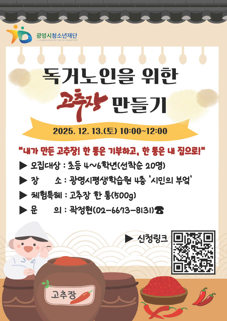 | 프로그램명 | [초등요리체험] 독거노인을 위한 고추장 만들기 | 기관명 | 광명시청소년재단 | ||