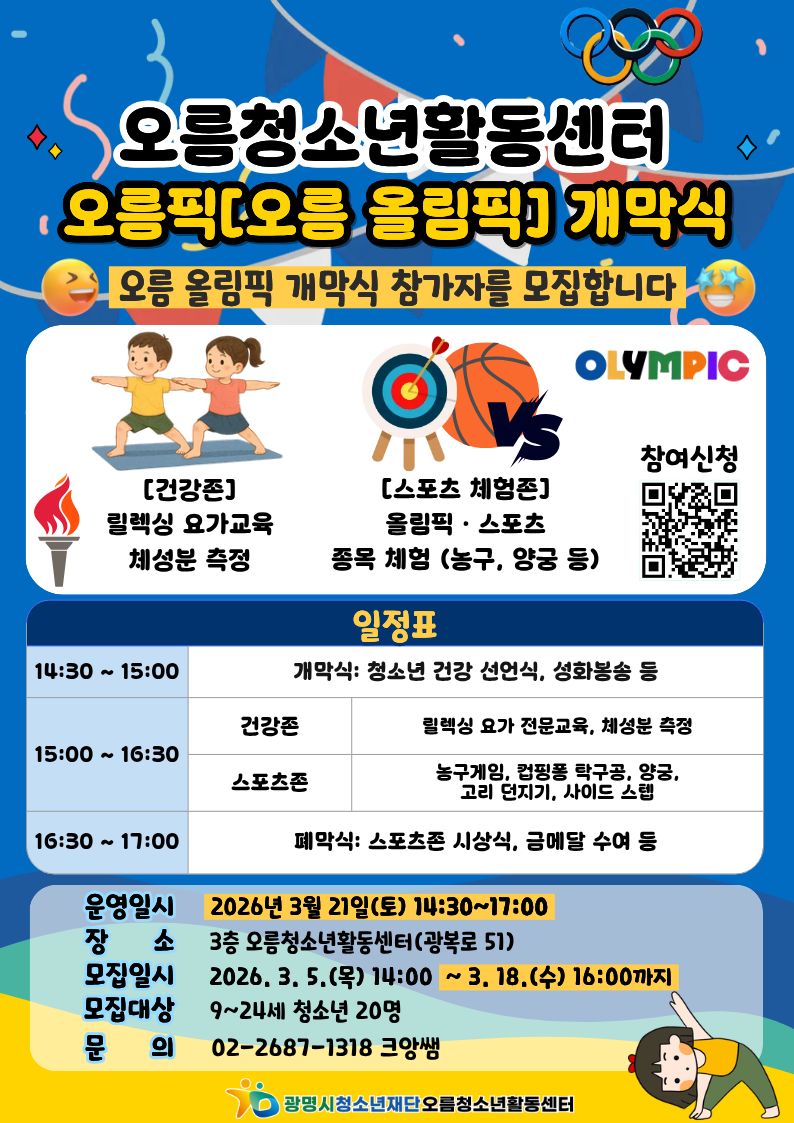 | 프로그램명 | 오름픽[오름 올림픽] 개막식 참가자 모집 | 기관명 | 오름청소년활동센터 | ||